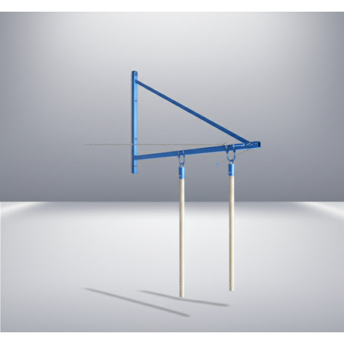Данная консоль предназначена для надежного крепления одного или двух спортивных снарядов, таких как гимнастические канаты и шесты. Она крепится к стене, и основание имеет треугольную форму с отверстиями для анкерных болтов, что обеспечивает устойчивость конструкции. На дальнем конце консоли имеется петля для крепления каната, а также две растяжки из стального троса, которые обеспечивают дополнительную безопасность.