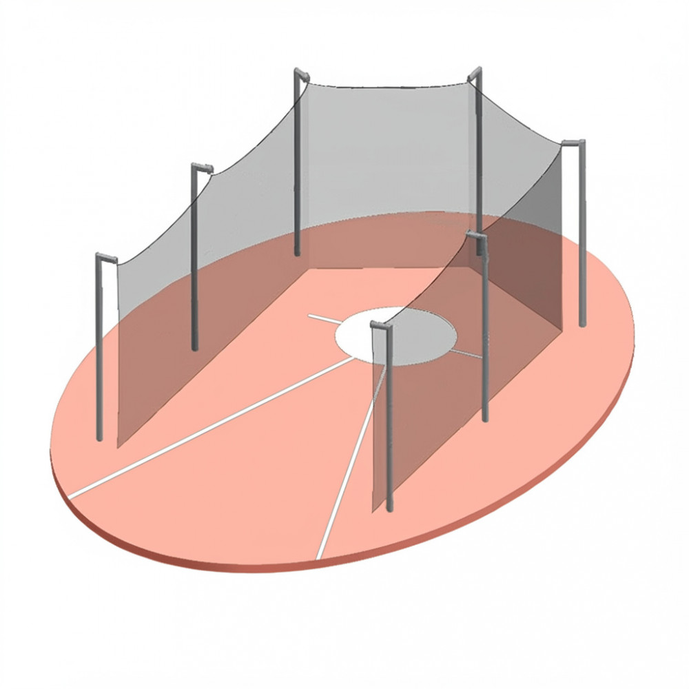 Сектор для метания состоит из 7 опорных столбов высотой 5 метров с прочными стаканами, предназначен для тренировок и соревнований по метанию молота и диска.