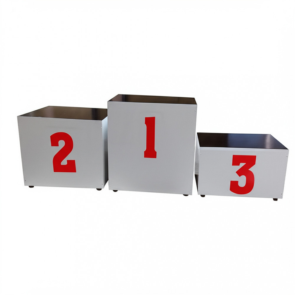 Пьедестал для победителей с металлическим каркасом, разборный, с обшивкой из влагостойкой фанеры толщиной 15 мм.