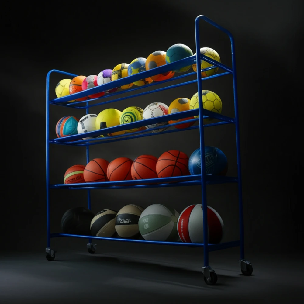 Данная конструкция на колесиках позволяет использовать её как стеллаж для хранения мячей и для их перевозки. Изготавливается для мячей различного диаметра и под разные виды спорта, такие как волейбол, баскетбол футбол и мини-футбол.