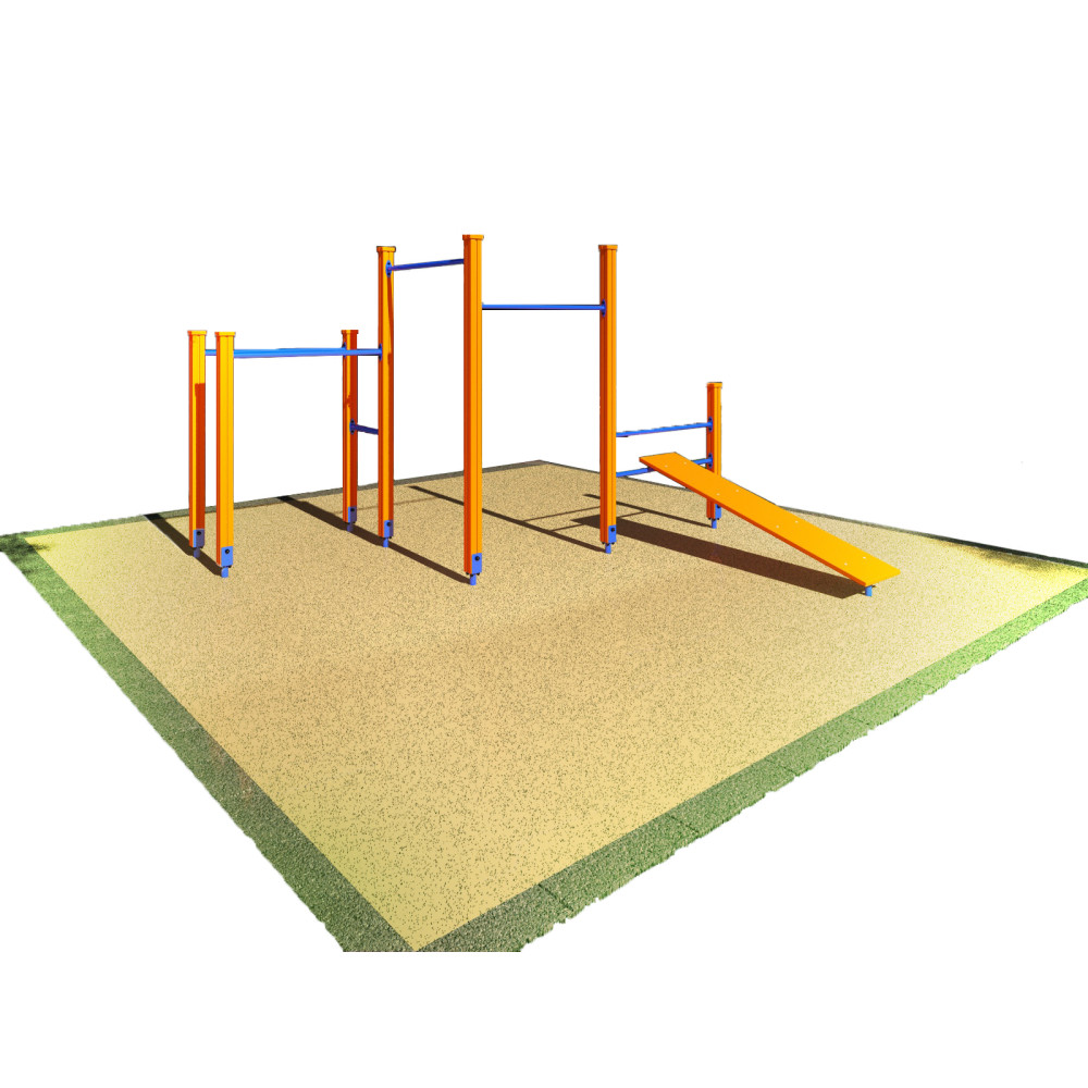 Спортивный комплекс № 3 включает в себя наклонную скамью, два турника разной высоты и брусья, предназначенные для эффективных тренировок всего тела.